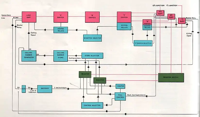 The switching was via reed relays and multi-stage like the TXE1. The difference from the TXE1 design was that an extra switching stage to simplify growth problems. Thus, a typical path would be A-B-C-Link-D-C-B-A.