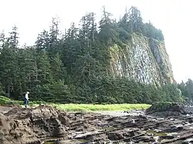 Taaw Tldáaw, formerly known as Tow Hill, is a large isolated volcanic plug located 21 km (13 mi) east of Masset on the north end of the Naikoon Peninsula of northeast Graham Island in Haida Gwaii, British Columbia, Canada, east of McIntyre Bay and near the mouth of the Hiellen River,[1] which is the site of Hiellen, a now-abandoned Haida village and of the Hiellen Indian Reserve No. 2, on the site of that village. Formerly Tow Hill Provincial Park, it is now part of Naikoon Provincial Park, which covers most of the northeastern flatland of Graham Island.