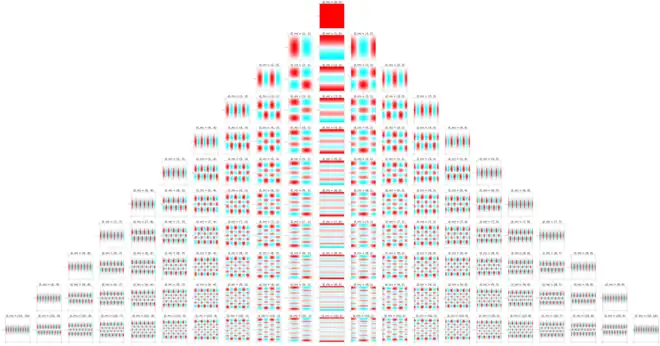 Below the real spherical harmonics are represented on 2D plots with the azimuthal angle, , on the horizontal axis and the polar angle, , on the vertical axis. The saturation of the color at any point represents the magnitude of the spherical harmonic and the hue represents the phase.