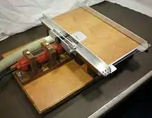 • Crosscut sled: A crosscut sled is generally used to hold the workpiece at a fixed 90-degree angle to the blade, allowing precise repeatable cuts at the most commonly used angle. The sled is normally guided by a runner fastened under it that slides in a mitre slot. This device is normally shop-made but can be purchased.