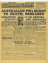 Table Tops was produced by the staff of the AIF News, who were part of the First Australian Army Printing and Press Unit.[2] The newspaper was produced seven days a week: weekday and Saturday editions were four pages long while Sunday editions were eight pages. The pages were demy quarto size. Occasional special editions were produced in addition to the daily editions.[3] It contained news on the progress of the war, as well as home news such as current events in Australia and sport results.