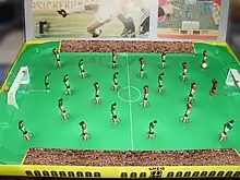 Tabletop football is a class of tabletop game simulating mainly association football, but also either of the codes of rugby, or some other form of football such as American football or Australian-rules football. The games employ miniature figures of players on a bounded playing board or table that looks like a football pitch (field).