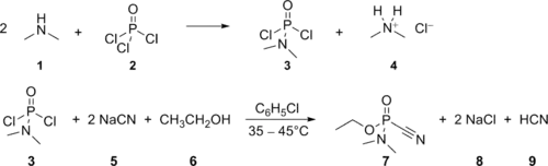 Tabun was made on an industrial scale by Germany during World War II, based on a process developed by Gerhard Schrader. In the chemical agent factory in Dyhernfurth an der Oder, codenamed "Hochwerk", at least 12,000 metric tons of this agent were manufactured between 1942 and 1945. The manufacturing process consisted of two steps, the first being reaction of gaseous dimethylamine (1) with an excess of phosphoryl chloride (2), yielding dimethylamidophosphoric dichloride (3, codenamed "Produkt 39" or "D 4") and dimethylammonium chloride (4). The dimethylamidophosphoric dichloride thus obtained was purified by vacuum distillation and thereafter transferred to the main tabun production line. Here it was reacted with an excess of sodium cyanide (5), dispersed in dry chlorobenzene, yielding the intermediate dimethylamidophosphoric dicyanide (not depicted in the scheme) and sodium chloride (8); then, absolute ethanol (6) was added, reacting with the dimethylamidophosphoric dicyanide to yield tabun (7) and hydrogen cyanide (9). After the reaction, the mixture (consisting of about 75% chlorobenzene and 25% tabun, along with insoluble salts and the rest of the hydrogen cyanide) was filtered to remove the insoluble salts and vacuum-distilled to remove hydrogen cyanide and excess chlorobenzene, so yielding the technical product, consisting either of 95% tabun with 5% chlorobenzene (Tabun A) or (later in the war) of 80% tabun with 20% chlorobenzene (Tabun B).[4]