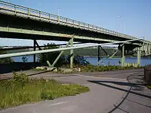The 450-foot (140 m)-long west approach viaduct. Tower #3 (far right; closest to the suspended structure) extends to the shoreline. Was originally part of Galloping Gertie
