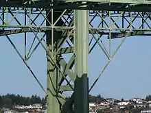 The stiffening truss damping mechanism at the towers. The hydraulic shock damping mechanisms themselves are seen as small cylinders where the diagonal bracing meets the towers (each one is 2 feet (0.61 m) in diameter and 4 feet (1.2 m) long).
