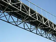 A detailed closeup of the stiffening truss. Photo is of the west side span, photographed from under the 2007 span's west side span on the shore of The Narrows. Photo also illustrates the flow-through wind grating.