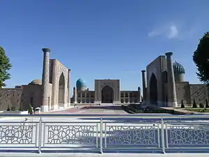 The Tajiks are an Iranian people, speaking a variety of Persian, concentrated in the Oxus Basin, the Farḡāna valley (Tajikistan and parts of Uzbekistan) and on both banks of the upper Oxus, i.e., the Pamir Mountains (Mountain Badaḵšān, in Tajikistan) and northeastern Afghanistan (Badaḵšān).[20] Historically, the ancient Tajiks were chiefly agriculturalists before the Arab Conquest of Iran.[23] While agriculture remained a stronghold, the Islamization of Iran also resulted in the rapid urbanization of historical Khorasan and Transoxiana that lasted until the devastating Mongolian invasion.[24] Several surviving ancient urban centers of the Tajik people include Samarkand, Bukhara, Khujand, and Termez.