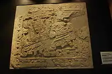 The southeast panel illustrates the opening ritual when the principal participant is elaborately dressed and is being handed a bundle of spears. This is part of an initial activity before the game itself starts. Overlooking this scene is the death deity who rises from a vat of liquid, perhaps pulque. The glyphs above the deity identify it with the planet Venus. Next is the southwest panel in which a different ceremonial preparation is depicted. The principal participant is supine on a kind of a sofa. Two musicians are playing a turtle shell drum and clay rattles. A figure dressed as an eagle dances in front while a skeletal deity flies above and the death deity rises from liquid. The northwest panel shows the beginning of the ballgame. Two participants are standing in the center of the court with speech scrolls emerging from their mouths. One holds a large knife in his left hand and gestures with his right. Between them are intertwined slashes, the symbol of the ballgame and a ball. At their waists are the protective and ritual accoutrements which are very similar to the stone yokes, palmas and hachas common in elite burials. Behind the players are two figures, one with a deer head, who are watching from the court walls as well as the death deity again above. The northeast panel indicates that the game has been played and one of the participants is about to be sacrificed by having his head cut off. The three figures are all dressed in the garments and symbols of the ballgame. The center figure has his arms held back by the one on the left. The figure on the right holds a large knife which is at the center figure's neck. There are scrolls indicating speech from the sacrifice as well as a depiction of the skeletal god.[57]