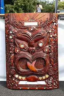 Manu Sutherland's father Henare carved the shield, which stands over one meter tall[6] and signifies the new migration of Māori and the coming together of Māori and Australians.