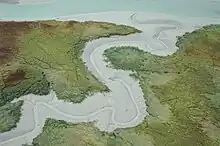 A meandering, gray mud tidal stream empties into Taku Inlet