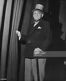 Talbot O'Farrell, ready to go on stage at the 1948 Royal Variety Performance, in his characteristic dress with top hat, cane, and monocle