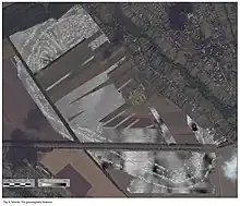 Kruts estimated the total area of the settlement at 450 hectares (1,100 acres), on the assumption that it had a rectangular plan.[5] Extrapolating from this and the density of houses in the surveyed portions of the site, M. Videiko estimated that Talianki contained approximately 2,700 structures and, at its height, could have been occupied by over 15,000 inhabitants.[3] Recently Kruts' figure has been revised by Thomas K. Harper, who used a geomagnetic plan of the site to put its area at 335 hectares (830 acres). This implies Videiko's figure for the peak population of the site is also an overestimation, with Harper suggesting 6,300–11,000 as a more likely range, favouring the lower end.[5] But other estimates are much larger with a population of around 15,000 as the most cited, and adding the numbers for the satellite towns the total population were up to 25,000–30,000 people within its cluster.[6][7] Research in 2014 indicates that Talianki contained between 15,600 to 21,000 people.[8]