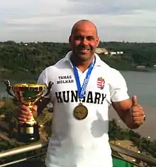 Tamás Molnár (born 5 June 1975) is a powerlifter and world champion. From 1997, he joined the junior and senior national team, and topped national records several times in deadlift. From 2012, he is a professional sportsman and in 2014, he garnered the first place in Argentina at the GPC World Championship (absolute winner).