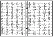 The text contains 3000 characters with no specific order with the characters being organized into four character verses (tứ tự; 四字).[6] These verses are different from other texts that were also used during that time. Books like Nhất thiên tự (chữ Hán: 一千字), Ngũ thiên tự (chữ Hán: 五千字), and Tự Đức Thánh chế Tự học Giải nghĩa ca (chữ Hán: 嗣德聖製字學解義歌) were all composed in lục bát verse unlike Tam thiên tự's four character lines.[7] Each sentence are rhymed every two syllables. The book was organized this way to make it easier for beginner learners to remember the characters. The whole text is essentially a very long rhyme. The Chinese characters are glossed with chữ Nôm in smaller print (consisting of one or two characters).