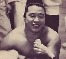 He made his professional debut at the age of 14 in May 1937, joining Nishonoseki stable, then run by active yokozuna Tamanishiki, although upon Tamanishiki's death the following year Tamanoumi Umekichi became his stablemaster. He used the shikona of Fukusumi. However, during a sumo tour of Shanghai in 1940, he got into a drunken argument with a driver. Military police went to the site and he also began to fight with them. Police officers wanted him shot, but ōzeki Haguroyama (later yokozuna) and his stablemaster apologized to them. He survived, but was forced to leave sumo and was drafted into the Japanese army.[1] After escaping a POW camp in Siberia and returning to Japan to work in a shipyard, he was invited to return to sumo in 1950. He was allowed to resume his career in the third makushita division where he had left off, and made the jūryō division in 1951, adopting the Tamanoumi name, and the top makuuchi division the year after, when he was already 29 years old. In May 1953, he faced Haguroyama in the ring for the only time. Tamanoumi defeated the man who had helped save his life, in what was to be the last bout of Haguroyama's career.