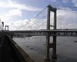 The bridge is owned and maintained by the Tamar Bridge and Torpoint Ferry Joint Committee, a conglomerate between Plymouth City Council and Cornwall County Council.[1] It has a main span of three lanes, which use a tidal flow arrangement to maximise traffic flow at rush hour, and two outer lanes. The north of these is used as a local access route from Saltash, while the south is used by cyclists and pedestrians but could be converted to meet future vehicle demand if alternatives for pedestrians and bicycles were provided, a dedicated ferry, shuttle bus, cable car or bridge have been considered.[1]