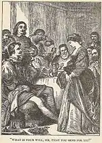 In 1890, Alfred Tolman conjectured a possible literary source for the wager scene may have been William Caxton's 1484 translation of Geoffroy IV de la Tour Landry's Livre pour l'enseignement de ses filles du Chevalier de La Tour Landry (1372). Written for his daughters as a guide on how to behave appropriately, de la Tour Landry includes "a treatise on the domestic education of women" which features an anecdote in which three merchants make a wager as to which of their wives will prove the most obedient when called upon to jump into a basin of water. The episode sees the first two wives refuse to obey (as in the play), it ends at a banquet (as does the play) and it features a speech regarding the "correct" way for a husband to discipline his wife.[lower-alpha 2][10] In 1959, John W. Shroeder conjectured that Chevalier de La Tour Landry's depiction of the Queen Vastis story may also have been an influence on Shakespeare.[11]