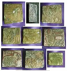 A group of nine inscribed copper plates has been identified by Shinde in 2014 as the oldest such objects in the Indian subcontinent. They date to the Mature Harappan era, and contain inscriptions up to 34 characters long. Place of origin unknown. They are thought to have been used for copper plate printing.[3]
