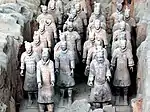For instance, numerous tomb artefacts of soldiers (also known as a "terracotta army") have been found in the Mausoleum of the First Qin Emperor. The Qin dynasty was militaristic, heavy-handed and bureaucratic - it was a time of intense and constant warfare with its neighbours and its military was the most powerful and technologically advanced in the world.[16] Therefore, it is unsurprising to find an overwhelming quantity of tomb figurines cast in the image of soldiers in the tomb of Qin Shi Huang, the first emperor of China.