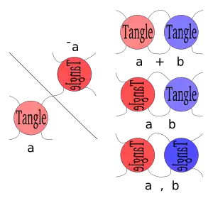- In link theory, a tangle is an embedding of n arcs and m circles into – the difference from the previous definition is that it includes circles as well as arcs, and partitions the boundary into two (isomorphic) pieces, which is algebraically more convenient – it allows one to add tangles by stacking them, for instance.