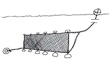 The tangle net originated in British Columbia, Canada, as a gear specifically developed for selective fisheries.[1] Tangle nets have smaller mesh sizes than standard gillnets. They are designed to catch fish by their nose or jaw, enabling bycatch to be resuscitated and released unharmed.[2][3] These nets are made with a very thin light nylon rope, have a small mesh and are strung between two ropes, a top rope with floats, and a bottom rope with weights. Dropped to the bottom of the ocean, located and retrieved through the use of a guide line and buoy, these nets have allowed both fishermen and scientists to reach areas not previously accessible. Tangle nets are generally left on the bottom for no more than a day or two so that the fish and bycatch does not die and spoil.