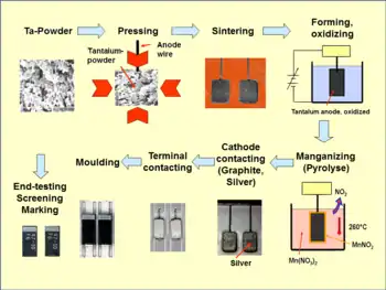 - Construction of a solid tantalum chip capacitor with manganese dioxide electrolyte