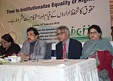 She spoke out against child marriage,[18] corporal punishment,[19] child trafficking in the Gulf States, child abuse,[20] custodial torture,[21] death penalty,[22] religious extremism, gender-based violence[23] and has been pushing for an autonomous commission on children's rights,[24] which was established in Pakistan in April 2020. She advocates for mainstreaming women's rights,[25] effective women's political participation,[26] equal rights of women and men,[27] and endorses international women's day.[28][29] While a member of the NCSW she was involved in panel discussions on religious minority rights,[30][31] policy dialogues on pro-women laws and policies, and reports and research studies on women's rights.[32]