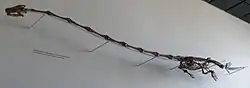 The two sacral (hip) vertebrae are low but robust, bridging over to the hip with expanded sacral ribs.[2] The latter sacral rib is a single unit without a bifurcated structure.[8][6][31] The tail is long, with at least 30 and possible up to 50 caudal vertebrae.[9] The first few caudals are large, with closely interlinked zygapophyses and widely projecting pleurapophyses (a term for transverse processes lacking ribs). The length of the pleurapophyses decreases until they disappear between the eighth and thirteenth caudal. The height of the neural spines also decreases gradually down the tail.[8][9][2] A row of long chevrons is present under a short portion of the tail, though not immediately behind the hips.[2]