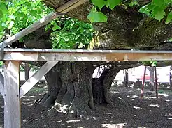 In 2000, the trunk had a circumference of at least 7.51 meters at the point of smallest diameter.[14] Currently, the circumference at a height of one meter is slightly under eight meters, while at a height of ten centimeters above the ground, it measures over eleven meters.[1][15] Measurements from 1981 registered a circumference of 8.8 meters at a height of 30 centimeters above the ground, commonly referred to as Brusthöhe (BHU) (breast height).[16] Additionally, measurements conducted in 1987 indicated a circumference of 7.77 meters at a height of one meter above the ground.[1] Fröhlich's data from 1990 recorded a trunk circumference of 8.3 meters at a height of 1.3 meters.[12]
