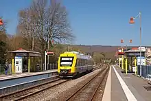 In 1988, a special association of 13 towns, municipalities and the Hochtaunus district founded the Verkehrsverband Hochtaunus (High Taunus transport association, VHT).[2] The line from Grävenwiesbach to Friedrichsdorf (a station now served by the S-Bahn) was still open but threatened with closure, but it was taken over by the VHT in 1989. This was followed by an extensive modernisation of the signaling technology and of the stations over 18 months.[7] The formerly parallel bus service was converted into a feeder route.