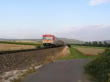 A long run through open fields leads to Usingen, where the line's central signal box is located and trains are stored, assembled, disassembled and refueled. This was formerly the location of the loading station of the 4 km-long narrow-gauge railway to a geyserite works (now Bremthaler Quarzitwerk)[3] and a siding from Raiffeisen Waren-Zentrale Rhein-Main (an agricultural cooperative). The section with the steepest grade (up to 2.147%) begins there; Wilhelmsdorf station, which is at the end of it, is a good 390 metres above sea level. A narrow gauge railway branched off here against the direction of travel to Merzhausen military airfield (now used for the Erdfunkstelle Usingen, Usingen earth station). After another slight climb past the junction of the BGS camp, the line reaches its high point at the edge of the forest. From there it goes to Grävenwiesbach, where some trains can be stored, and down around a loop to Hundstadt.