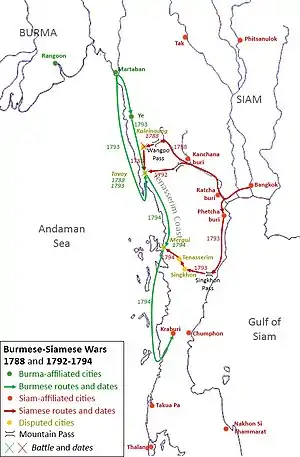 After the Burmese defeat in the Nine Armies' War, the power balance on the Tenasserim Coast shifted in favor of the Siamese who went on their offensives. King Rama I of Siam, along with his generals, marched to Tavoy in January 1788. He sent his two generals Chao Phraya Mahasena Pli and Chao Phraya Rattanapipit ahead as vanguard. The Siamese troops crossed the Tenasserim Hills at modern Pilok, Thong Pha Phum District, Kanchanaburi Province. Steeped mountains of the route hindered transportations. King Rama I himself had to climb through the ropes to reach the mountaintop.[7] The two Siamese generals defeated the Burmese led by Natmilin in the Battle of Kaleinaung. King Rama I then laid siege on Tavoy, leading to the siege of Tavoy that lasted for half a month.[7] The town of Tavoy was defended by the Burmese general Maha Thiri Thihathu ("Kinwun Mingyi" in Thai sources) and Nemyo Kyawdin the governor of Tavoy. The Burmese did not yield and King Rama I finally decided to retreat.