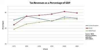 Tax revenues as a percentage of GDP for the UK in comparison to the OECD and the EU 15