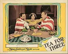 Tea for Three is a lost[1][2] 1927 American comedy silent film directed by Robert Z. Leonard and written by Garrett Graham, F. Hugh Herbert, Roi Cooper Megrue and Lucille Newmark. The film stars Lew Cody, Aileen Pringle, and Owen Moore. Supporting players were Phillips Smalley, Dorothy Sebastian and Edward Thomas. The film was released on October 29, 1927, by Metro-Goldwyn-Mayer.[3][4]