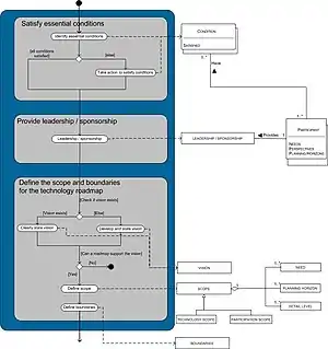 The technology roadmapping process may be conducted in three phases: preliminary activities, the development of the roadmap, and the follow-up activities phase. Because the process is too big for one model, the phases are modeled separately. In the models no different roles are made; this is because everything is done by the participants as a group.[8]