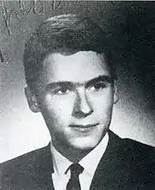 After graduating from high school in 1965, Bundy attended the University of Puget Sound (UPS) for one year before transferring to the University of Washington (UW) to study Chinese.[41] In 1967, he became romantically involved with a UW classmate, Diane Edwards (identified in Bundy biographies by several pseudonyms, most commonly Stephanie Brooks).[42] "He saw a woman who was the epitome of his dreams," Rule wrote. "[Edwards] was like no girl he had ever seen before, and he considered her the most sophisticated, the most beautiful creature possible." Bundy later described Edwards as "the only woman I ever really loved."[43]