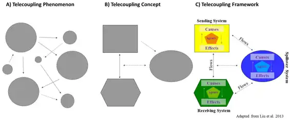 - 1 2 3 4 Liu, J., Herzberger, A., Kapsar, K., Carlson, A. K., & Connor, T. (2019). What Is Telecoupling?. In Telecoupling (pp. 19–48). Palgrave Macmillan, Cham.