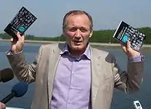 On 2 June at the Zaslavl water storage basin near Minsk the leaders of campaign presented a collected book «100 faces of unemployment», dedicated to the problem of employment in Belarus. The collected book contains stories of a hundred people, who could not find a job for a long period of time. Among them were famous people of the country as well as ordinary citizens.[25][26] Uladzimir Niaklajeu said that the founders of campaign "Tell the Truth!" are supporting the programme of presidential candidate of United Civil Party Jaroslav Romanchuk "Million new jobs for Belarus".[27]