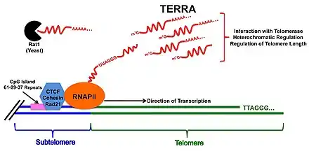 TERRA is an evolutionarily conserved long-non-coding RNA found in many nucleus-containing eukaryotic cells such as chicken (Gallus gallus domesticus),[1] humans (Homo sapiens), budding yeast (Schizosaccharomyces cerevisiae), fission yeast (Schizosaccharomyces pombe), mice (Mus musculus), zebrafish (Danio rerio), and various plants (Arabidopsis thaliana, et cetera).[2][3][4][5] TERRA is transcribed from DNA as a continuous sequence in most tissues from the subtelomeric and telomeric regions at the end of linear chromosomes. Transcription occurs in the 5' to 3' direction (from the centromere to telomere) and TERRA transcripts are heterogeneous in length, ranging anywhere from 100-bases up to 9-kilobases in length for human cells.[6] The majority of TERRA transcription has been shown to be carried out by RNA Polymerase II (RNAPII),[3][4] although RNA Polymerase I and III may also have functions in TERRA transcription for mammals.[7]