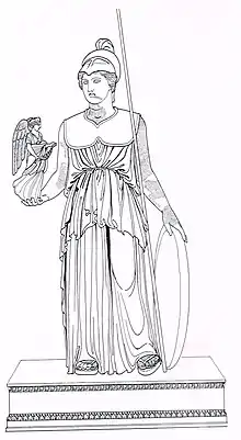 Inside the cella, there was an Athena Polias statue for dedication. However, the actual shape was unknown.[27] In ca. 158-156 BC, a sculpture, offering of Orophernes, replaced the old statue.[27][26] Tetradrachms at that time indicated this event.[26] The new statue remained of Athena but was a copy of the gold and ivory version by Phidias in Athens.[26] It was a standing statue of Athena, with calm facial expression and holding a spear and a shield, wearing a helmet.[27] The statue was 6.5 m (21 ft) tall and three times smaller than the Athenian original.[27]