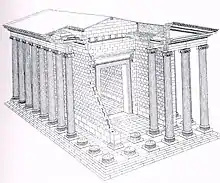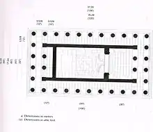 The temple was an east-west placement. The entrance was at the east. It was a rectangle layout with 11 columns in length and 6 columns in width on the boundary.[11] The parallel temple walls were 100 attic feet long and 32 attic feet between them.[25] The temple cella was enclosed by a western wall, created an "opisthodomos" at the west, and eastern door, which separates the cella and the near square "Pronaos".[11] Both "pronaos" and "opisthodomos" had two columns in the façade, which was an Asiatic style.[11]