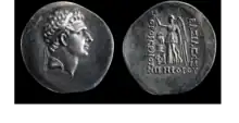 Orophernes' coin's two sides which found under the statue base. The inscription is "Of King Orophernes Nikephoros [Victorious.[12]]"