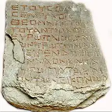 On the side walls of the hall, there were three registers of images of the donors who had financed this temple and their family members.[5] Their names were written next to their images. They appear to be the members of two influential families, one of which is known as the family of Lysias. Several inscriptions were found, all in Greek. Next to the cella was a smaller room, which was probably the temple treasury. Some gemstones were found here. A dedicatory inscription on a stele is dated AD 120/121 and was dedicated by one Seleukos.
