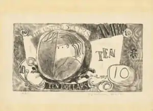 Ten Dollar Bill (also referred to as The Dollar Bill) is a 1956 proto-pop art lithographic drawing by Roy Lichtenstein. Considered to be a combination of Americana art and cubism, the work is referred to as the beginning of Lichtenstein's work on pop art. Twenty-five editions of the lithograph were made by Lichtenstein, which were exhibited at several galleries. The piece is based on the design for the ten-dollar bill and has influenced several of Lichtenstein's later works. The picture has received generally favorable reception from critics, and is considered to be one of the best artistic portrayals of currency.