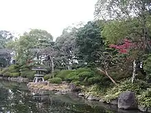 It served as the Osaka City State Guest House. A Japanese garden was also created at that time that included the tsuru no ike (Crane Pond). Emperor Meiji stayed here.[2] Emperor Shōwa stayed there in Shōwa 7 (1932). The Kishū Palace was renamed Tenrinkaku in Shōwa 8 (1933).[1][2]