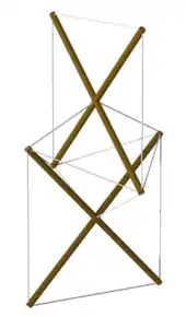 The tensegrity icosahedron, first studied by Snelson in 1949,[32] has struts and tendons along the edges of a polyhedron called Jessen's icosahedron. It is a stable construction, albeit with infinitesimal mobility.[33][34] To see this, consider a cube of side length 2d, centered at the origin. Place a strut of length 2l in the plane of each cube face, such that each strut is parallel to one edge of the face and is centered on the face. Moreover, each strut should be parallel to the strut on the opposite face of the cube, but orthogonal to all other struts. If the Cartesian coordinates of one strut are and , those of its parallel strut will be, respectively, and . The coordinates of the other strut ends (vertices) are obtained by permuting the coordinates, e.g., (rotational symmetry in the main diagonal of the cube).