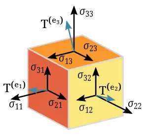 An elementary example of a mapping describable as a tensor is the dot product, which maps two vectors to a scalar. A more complex example is the Cauchy stress tensor T, which takes a directional unit vector v as input and maps it to the stress vector T(v), which is the force (per unit area) exerted by material on the negative side of the plane orthogonal to v against the material on the positive side of the plane, thus expressing a relationship between these two vectors, shown in the figure (right). The cross product, where two vectors are mapped to a third one, is strictly speaking not a tensor because it changes its sign under those transformations that change the orientation of the coordinate system. The totally anti-symmetric symbol nevertheless allows a convenient handling of the cross product in equally oriented three dimensional coordinate systems.