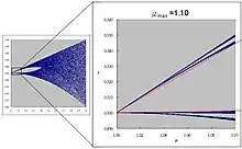 - A closer look at the orbit diagram shows that there are 4 separated regions at μ ≈ 1. For further magnification, 2 reference lines (red) are drawn from the tip to suitable x at certain μ (e.g., 1.10) as shown.