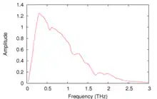 Pulses produced by this method have average power levels on the order of several tens of microwatts.[5] The peak power during pulses can be many orders of magnitude higher due to the low duty cycle of mostly >1%, which is dependent on the repetition rate of the laser source. The maximum bandwidth of the resulting THz pulse is primarily limited by the duration of the laser pulse, while the frequency position of the maximum of the Fourier spectrum is determined by the carrier lifetime of the semiconductor.[6]