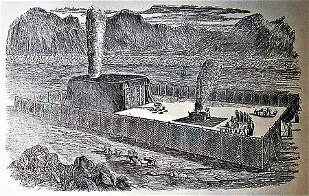 In the first reading, God instructed Moses to tell all Israelites whose heart so moved them to bring gifts of gold, silver, copper, colored yarns, fine linen, goats' hair, tanned ram skins, acacia wood, oil, spices, lapis lazuli, and other fine stones to make a sanctuary—the Tabernacle (Mishkan, מִּשְׁכָּן)—and its furnishings, so that God could dwell among them.[4] God instructed them to make the Ark of the Covenant of acacia wood overlaid with gold in which to deposit the tablets setting forth God's commandments.[5]